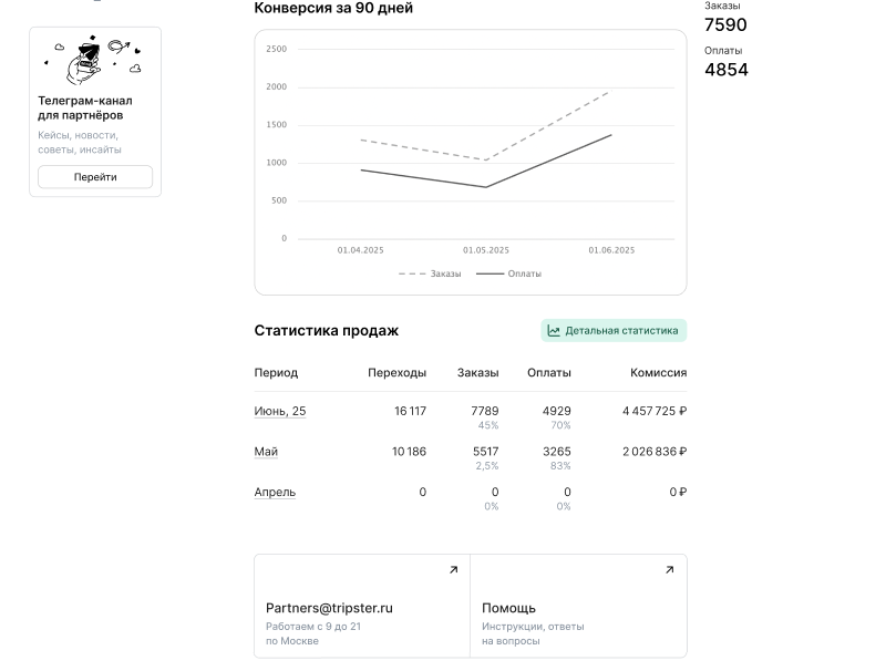 Это стартовый экран и главный инструмент для отслеживания динамики. По этой вкладке можно быстро понять, как идёт работа. Здесь партнёр видит ключевые цифры: баланс, комиссию, динамику продаж и конверсию. Всё собрано в одном месте, чтобы за пару минут оценить эффективность и понять, где сосредоточить усилия.