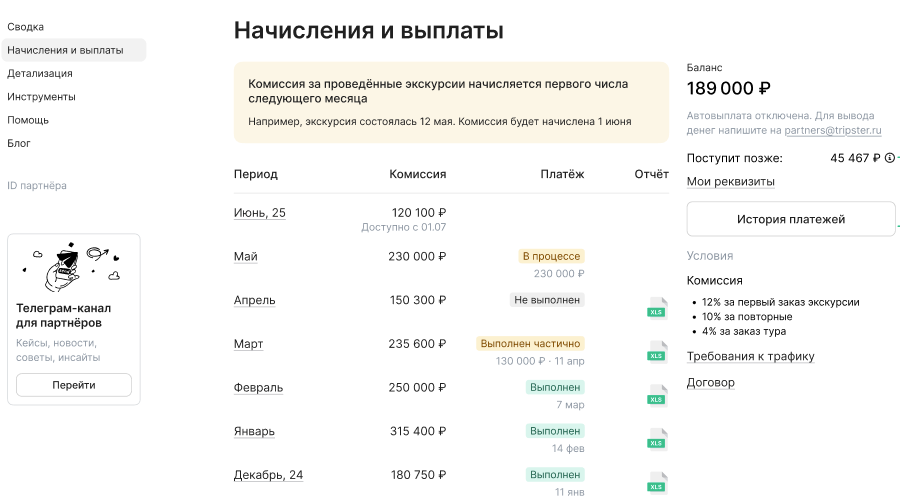 Тут вы можете управлять своими финансами и контролировать выплаты.Внутри вкладки найдете историю комиссий по месяцам, статусы выплат и сможете скачать детальные отчёты. Это поможет заранее планировать доход, быть уверенным в прозрачности расчётов и всегда иметь под рукой нужные документы.