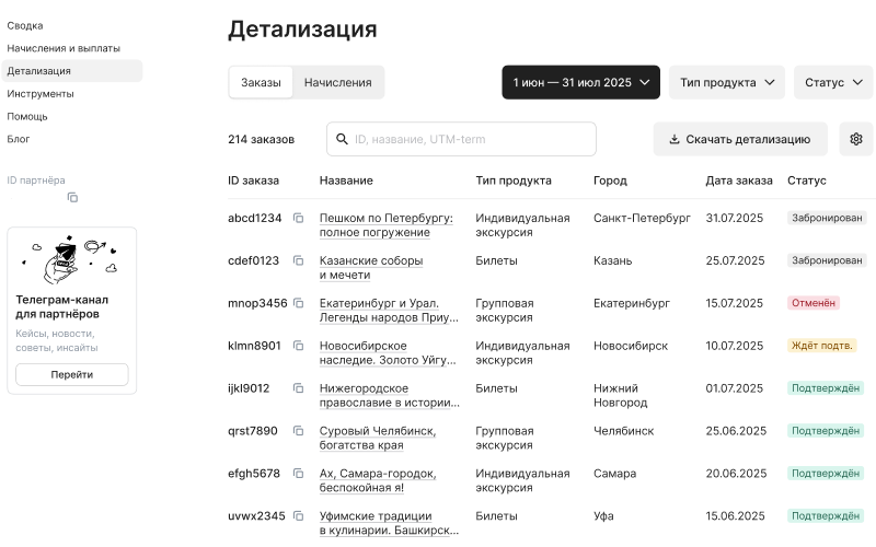 Помогает отследить статусы, причины отмен, типы продуктов и города, откуда приходят продажи. Настраиваемая таблица и фильтры позволяют искать ответы на конкретные вопросы: «какие экскурсии зашли лучше», «что чаще отменяли» или «какой канал дал максимальный результат».