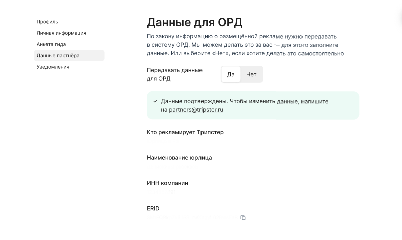 Если вы хотите, чтобы Tripster отчитывался по рекламе за вас, просто заполните данные. После этого статистика по маркированным креативам будет автоматически передаваться в ЕРИР через ОРД.