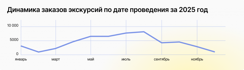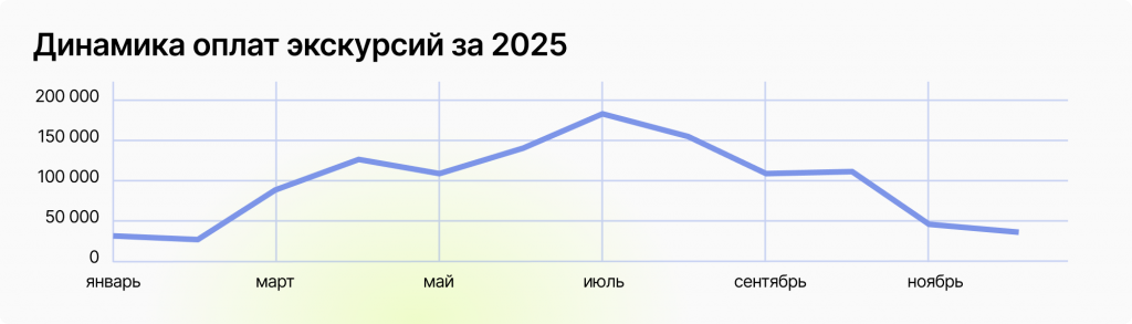 К путешествиям готовятся заранее: график оплат экскурсий показывает, что пики приходятся на июль, перед осенними каникулами, выходными в мае и 8 марта.