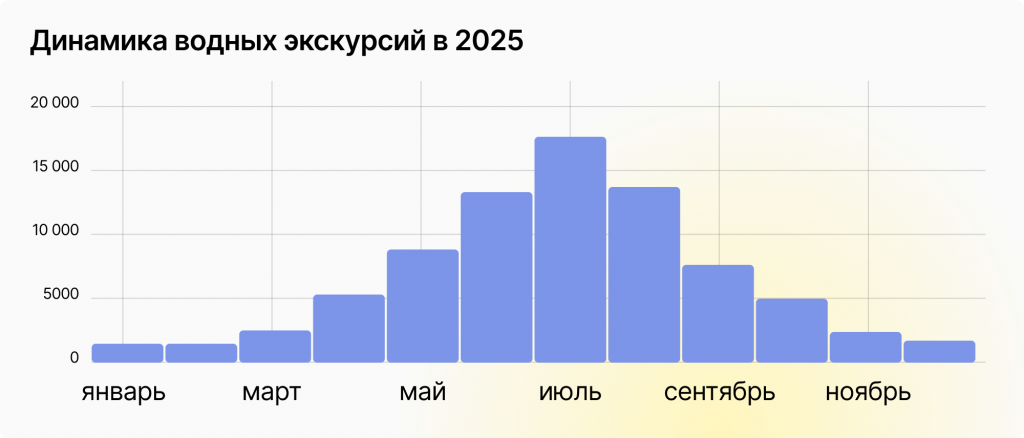Водные прогулки остаются лидерами спроса в летний сезон, их продажи растут в 12,6 раз по сравнению с зимним периодом. Рекордное количество бронирований поступает в июле.