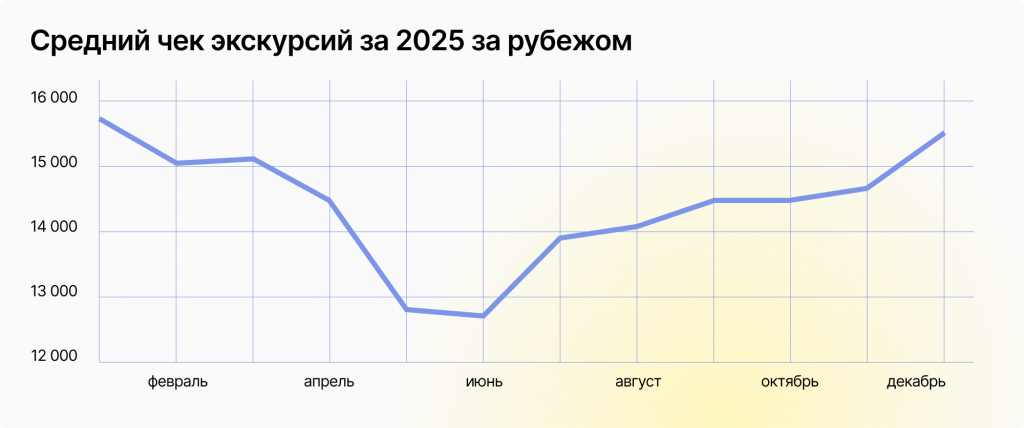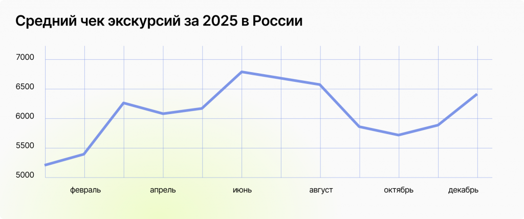 В России средний чек вырос на 13% и составил 5996 ₽. Дороже всего экскурсии обойдутся в период с мая по сентябрь, а дешевле — в феврале и октябре.